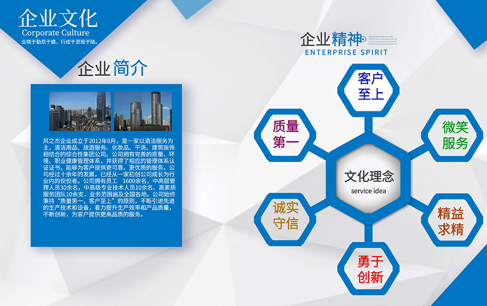 公司于2012年8月成立,致力于將9年的線下管理經驗進行線上整合,復制推廣,力爭打造一個全國性的家庭服務平臺,并基于家庭服務的大數(shù)據,融合人工智能,整合服務資源,為家庭提供全方位,多保障的管家式服務,目前風之杰已與全國百余家企業(yè)簽署戰(zhàn)略合作,通過全體員工堅持不懈的努力,逐步布局全國,完善服務,提高品質,一切努力,只為盡我所能,凈你所想。